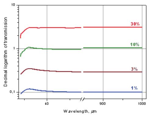 可调太赫兹衰减器由5个扇轮组成(包含四片太赫兹衰减片),其中扇轮中有金属化处理后的楔形硅片具有不同的衰减水平,一个扇轮是空的。如果需要,客户可在空的轮子可以装上其他器件(比如:过滤器等),四个太赫兹衰减器的透过率分别为30%、10%、3%、1%,这些衰减器可单独使用,也可联合使用以取得不同的衰减率。衰减器元件的透射曲线(噪声进行平滑处理)如下所示。图中给出了1000um以下的测试数据。当然,其工作波长范围可更广。