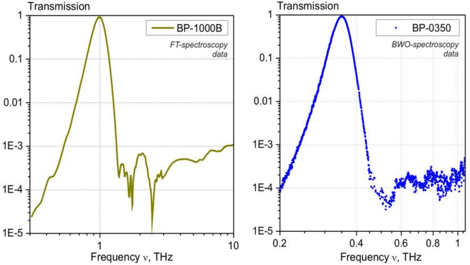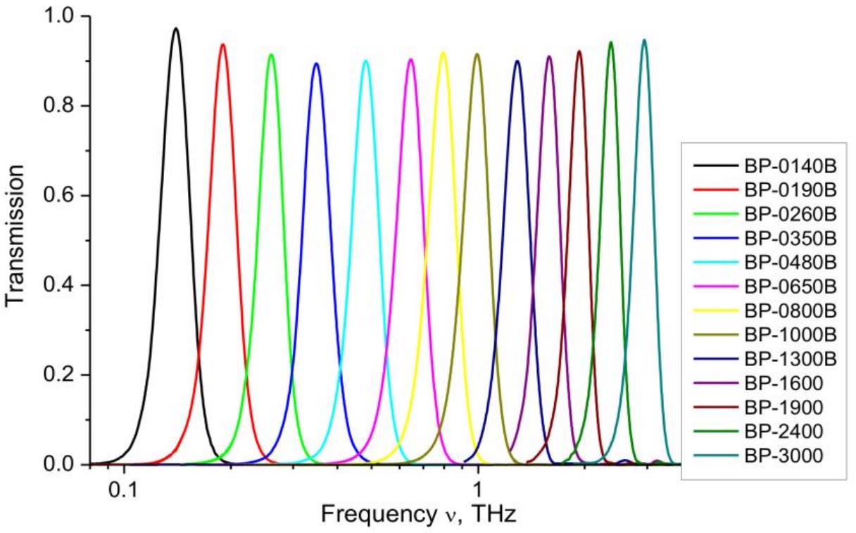 标准太赫兹带通滤波器实际测量光谱透过率,(BWO+傅里叶红外光谱仪测量结果)