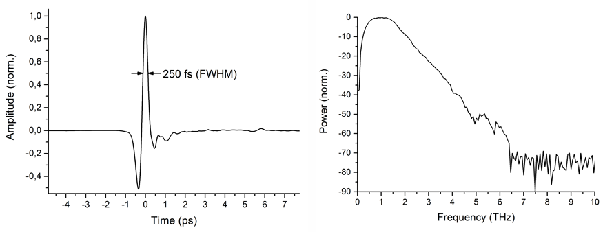 我们的THz发射器是基于一个专利技术(德国专利号:DE102012010926 A1),利用双金属光栅结构实现无偏压的光学泵浦THz辐射。THz发射器具有一个很大的可激发面积,激发光的功率可以从5mW高至1W,并不会引起转换效率饱和的现象。
