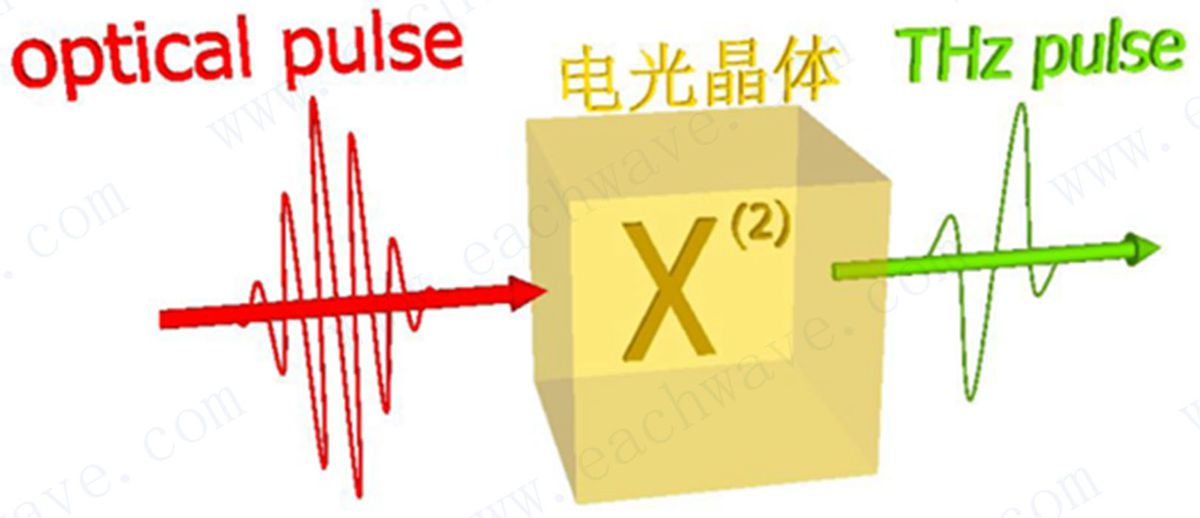 [110]晶向的ZnTe(碲化锌晶体)常通过光学整流来产生太赫兹振荡。光学整流效应是一种二阶非线性效应,也是一种特殊的差频效应。一定宽度的飞秒激光脉冲,拥有非常宽的频率分量,这些分量间的相互作用(主要是差频)将会产生从0到几个太赫兹的电磁波。