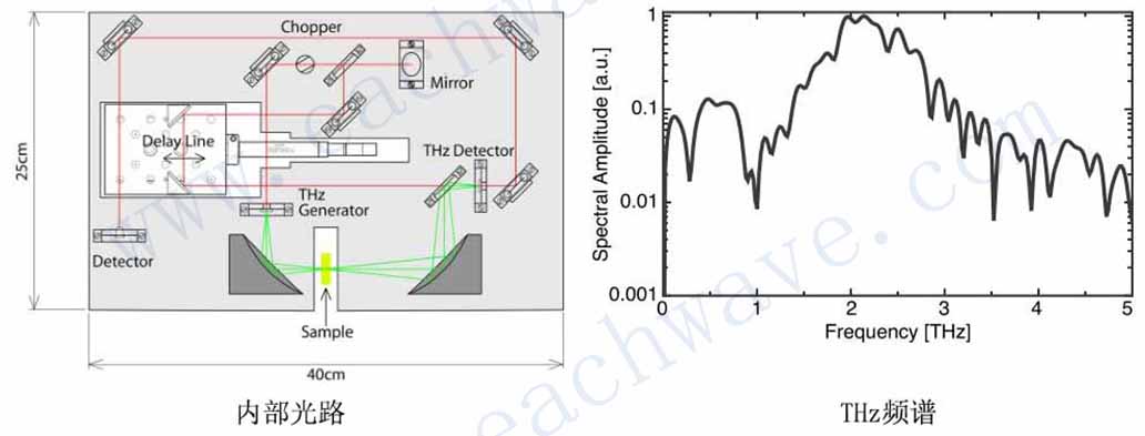 频谱范围 0.3-4THz 输出功率 > 50 nW 频谱分辨率 < 0.01 THz 偏振特性 > 100 : 1, 垂直 预热时间 15 min. 操作温度 18°C - 30°C 系统尺寸 40x25x18 cm3 TeraSys 4000内部光路以及频谱图: