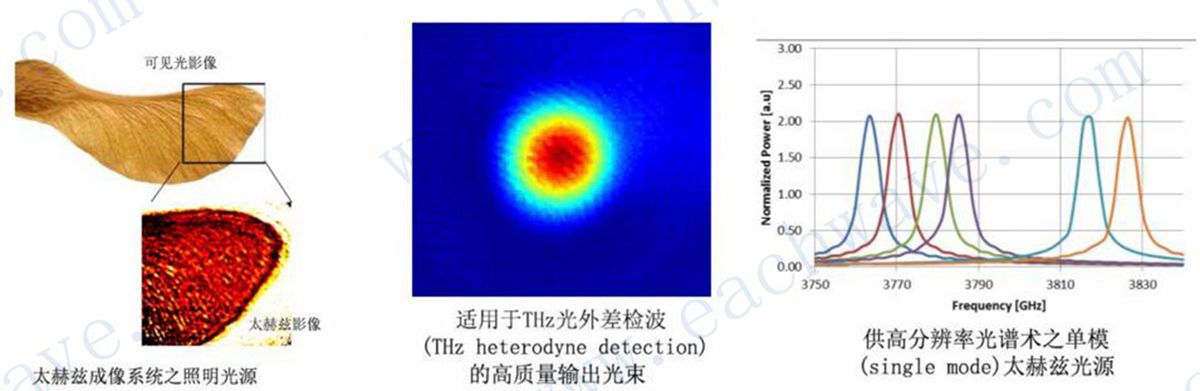 应用: — 焦平面数组器件(focal plane array) 的高功率太赫兹照明光源 — 太赫兹侦测器噪音与响应率 (noise and responsivity) 之特性测试 — 光外差检波技术 (heterodyne detection)之本地振荡器 (Local oscillator)