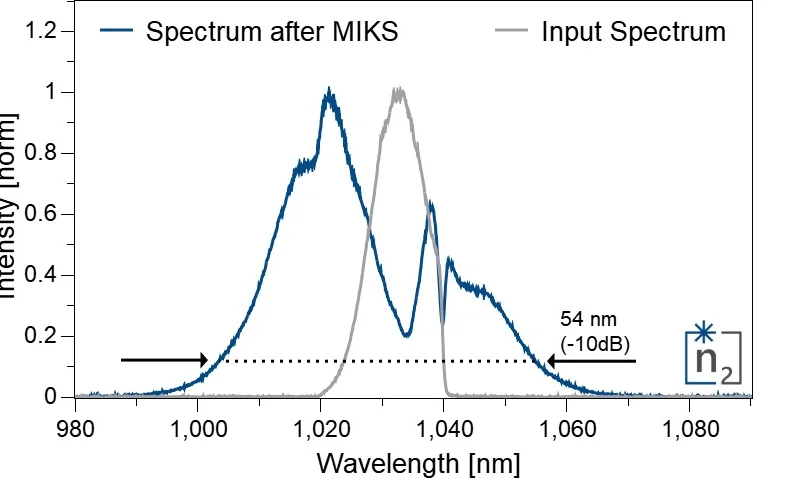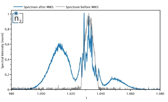 在这里,我们展示了由 neoLASE neoMOS SMAARTlaser 飞秒激光器泵浦驱动MIKS1_S 模块的性能。峰值功率可提高七倍,效率超过 90%。自相位调制频谱和脉冲压缩如下图所示。