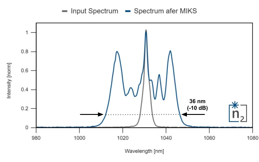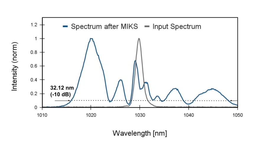 在这里,我们展示了由硬质合金飞秒激光器泵浦驱动 MIKS1_S 模块的性能。峰值功率可增加 4 倍,效率可达 95%。自相位调制频谱和脉冲压缩如下图所示。