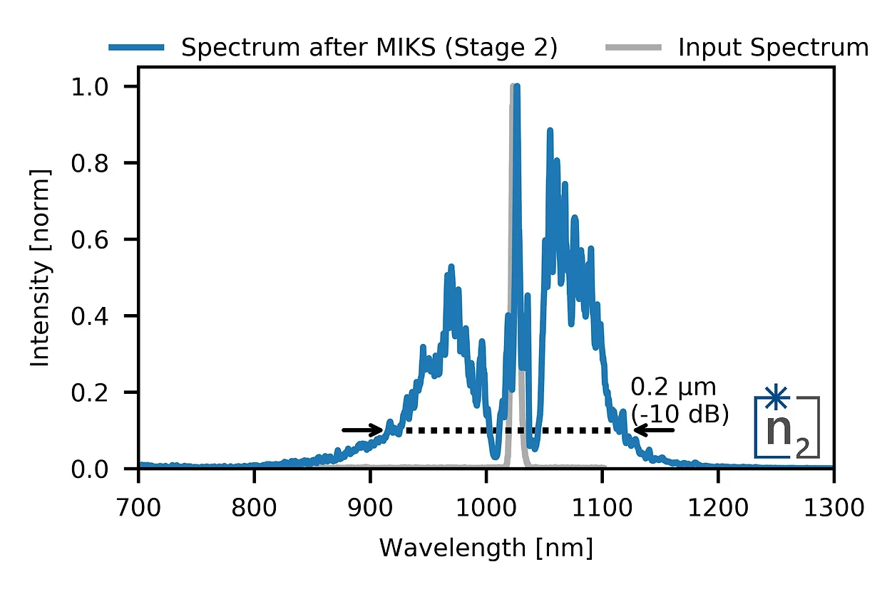 下面我们介绍从我们的 MIKS1_S 模块获得的结果,该模块由 Dira 200-100 飞秒激光器泵浦驱动。我们成功地将峰值功率显着提高了 11 倍以上,同时保持了超过 95% 的令人印象深刻的效率。下图说明了通过我们的实验实现的自相位调制频谱和脉冲压缩。