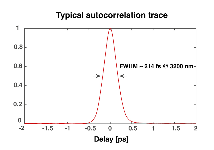 3200 nm脉冲的典型自相关轨迹。估计持续时间为214 fs