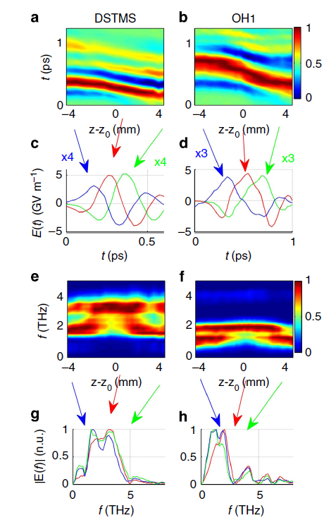 在lambda立方聚焦中,当瑞利长度最小化时,THz的时间和光谱形状预计将在腰部迅速改变。在图3a和b中,我们分别展示了DSTMS和OH1在聚焦位置(z=z0)周围传播(z)方向重建的THz时间剖面的时域图。说明了π穿过(z-z0) >>|zR|的古依相移,zR为瑞利长度。图3c,d为|z|>0在(z-z0)={-4,0,4} mm处的场时差演化和场强的快速衰减。腰部的光谱演变(图3e-h)显示,当我们接近焦点位置时,中心频率向更高频率强烈移动。这是λ3聚焦方案的直接结果,其中光斑大小ω0对THz波长的线性依赖性非常明显,因为低频率的λ3体积更大。这些结果对比了最近关于太赫兹聚焦于(松散的)非-λ3条件的报告。在后一种情况下,实验发现在焦点周围的光谱变得更宽,而中心没有移动。