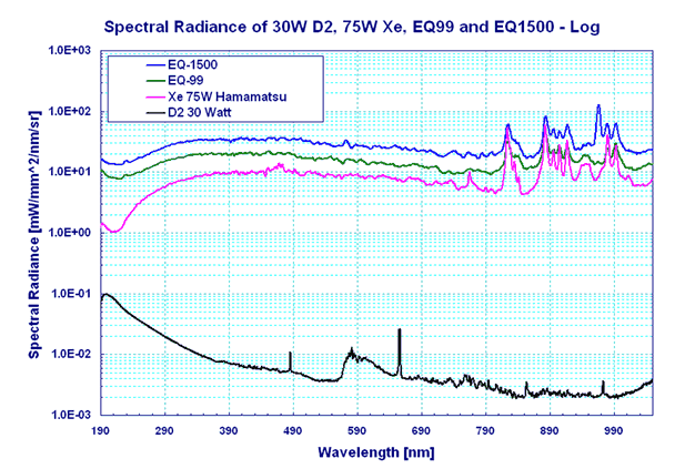 通常情况下,EQ-99 提供约10 mwatts/nm/mm?/sr的光谱辐射亮度(亮度)(取决于波长)和约0.5W总功率。