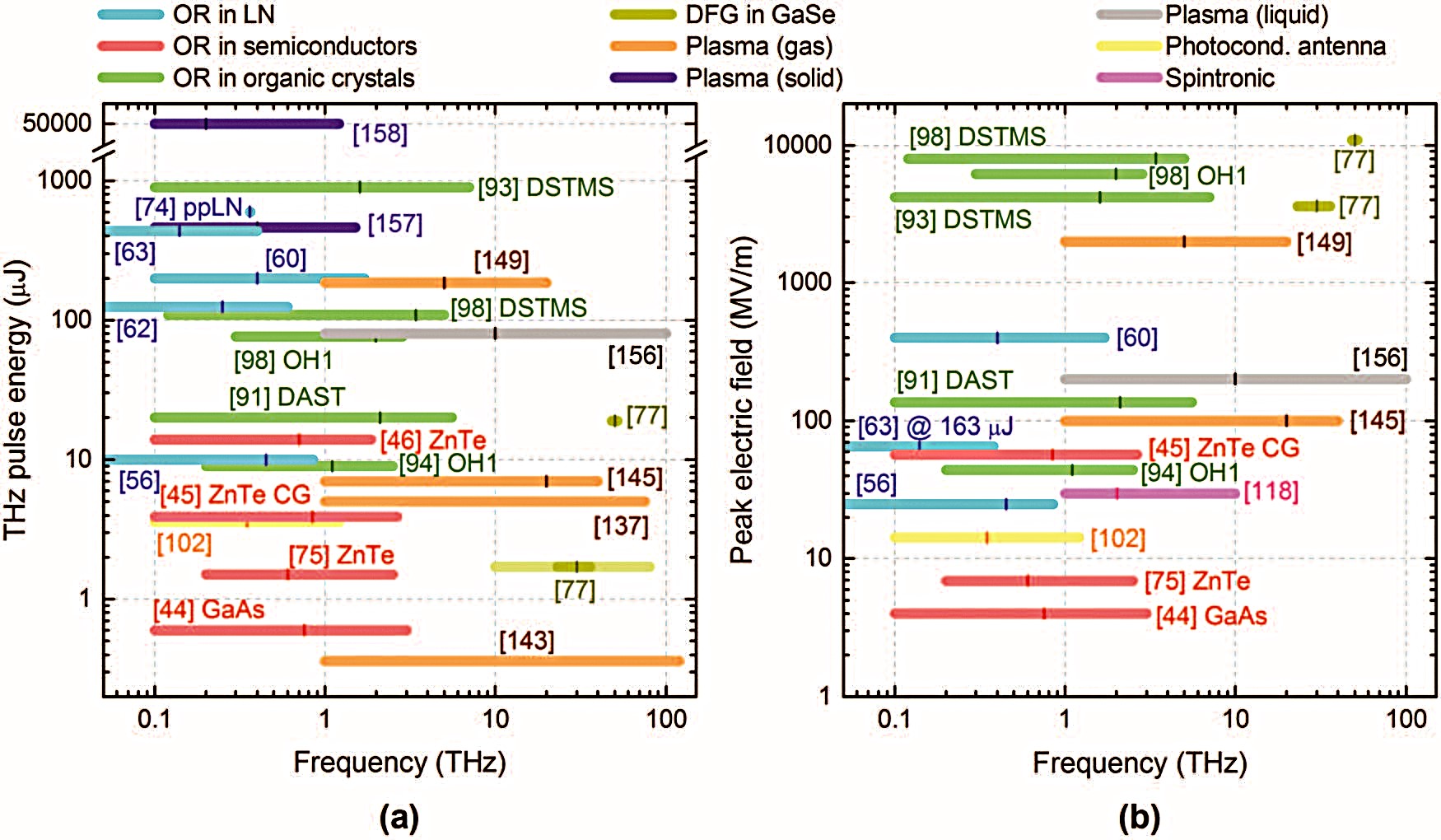 这些进展得益于激光驱动的台式 THz 源的开发,这些源常规提供前所未有的脉冲能量和峰值电磁场强度,覆盖整个 THz 频谱范围。不同的激光基础 THz 脉冲生成技术可用于访问从 0.1 到 10 THz 的频谱范围。近期开发的一些技术甚至能产生更大带宽或调谐范围,达到 100 THz 及以上,从而扩展了所谓的 THz 频谱范围。图1汇总展示了各种激光驱动技术,包括各种能产生强场太赫兹的太赫兹晶体的近似频谱覆盖范围、最高脉冲能量和峰值电场强度。