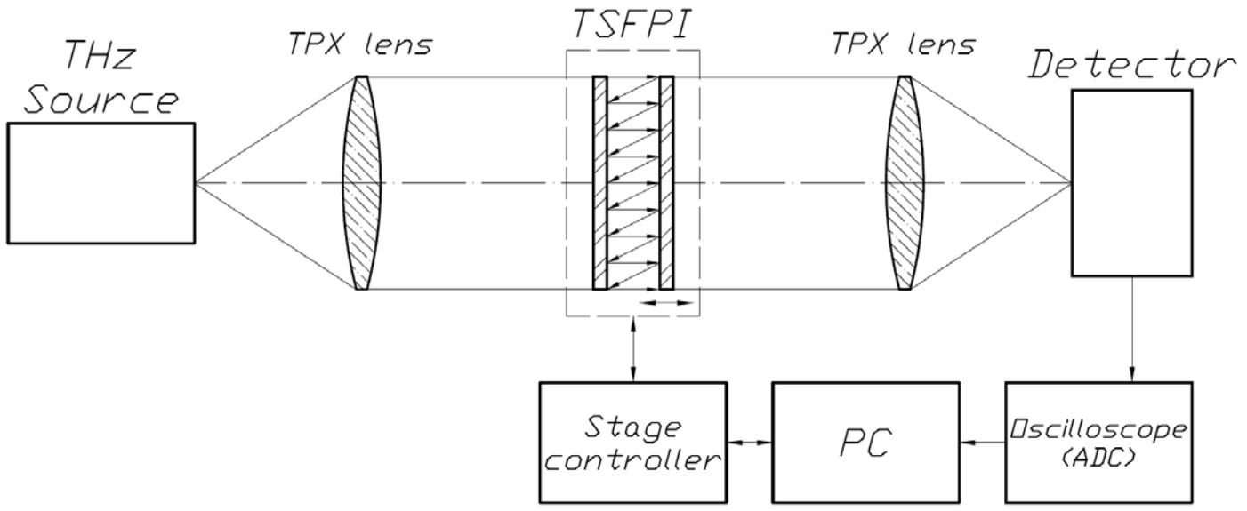 太赫兹频率测量系统是由高莱盒探测器Golay Cell,法布里-珀罗干涉仪(TSFPI),数据采集模块,TPX太赫兹透镜等一系列组件构成,具体示意图如下图所示。法布里-珀罗干涉仪是专门用来测试THz波长以及定标窄带THz辐射波长的仪器。由太赫兹源产生的太赫兹波经过TPX透镜进入TSFPI,之后通过另外一片TPX透镜进入到连接示波器的探测器中。TSFPI有两块半透明平行的Si反射镜组成,其中一个Si镜装在线性电机上,可以通过控制器控制Si镜之间的距离,PC上得到相应的信号输出,从而测量相应的THz频率波长数据。
