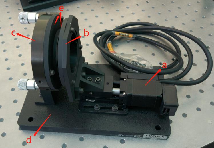 部件图: a – 电机传动器; b – 不可调反射镜安装架; c –可调节反射镜安装架; d – 底盘; e – 反射镜固定在支架上.
