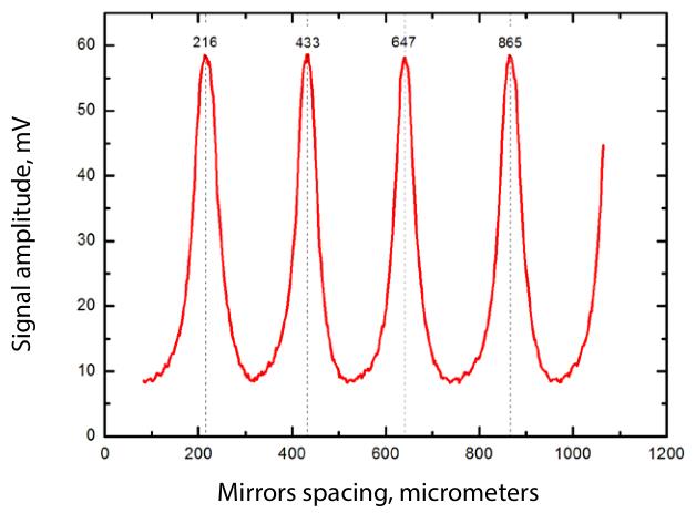 太赫兹频率测量系统用于测量亚太赫兹源,波长:432um(横轴为反射镜间距,纵轴为Golay Cell太赫兹探测器GC-1P测量到的信号强度)