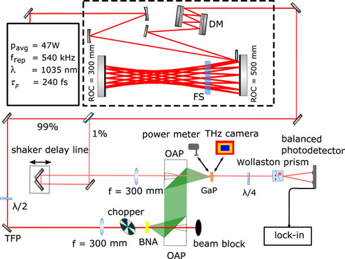 结果表明,用1035 nm激光以540 kHz重复频率泵浦,脉宽为45 fs,获得了高平均功率、宽带、高动态范围的THz-TDS。使用4.7 W的驱动功率,最大测量THz功率为5.6 mW,这是使用BNA获得的最大THz功率。计算的最大转换效率为0.12%,与使用该晶体在低得多的重复频率下获得的值相当。该光源代表了一个独特的工具,为各种时间分辨太赫兹光谱实验,目前限制的动态范围和带宽,潜在的非线性太赫兹光谱。我们认为,通过进一步优化晶体的冷却,在净化条件下工作,以及微调聚焦条件和光束斩波占空比,进一步将THz功率放大到几十mW是可能的。