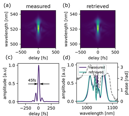 我们使用二次谐波生成频率分辨的方法 (SHG-FROG) 以上述重复率表征压缩脉冲。图 2(a)和2(b)显示测量和重建的 SHG-FROG 迹线,在 512 × 512 网格上显示出 0.3% 的检索误差,证实了检索迹线的良好保真度。图 2(c)显示检索到的脉冲的时间脉冲轮廓。在此重复率下实现的峰值功率为 1.4 GW,这使其成为非常有吸引力的高重复率激光系统,不仅适用于光学整流,也适用于其他非线性转换应用。图 2(d)显示了 MPC 后测量和重建的光谱和光谱相位,将其与使用光谱分析仪 (OSA) 测量的光谱进行比较。