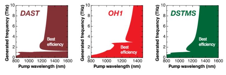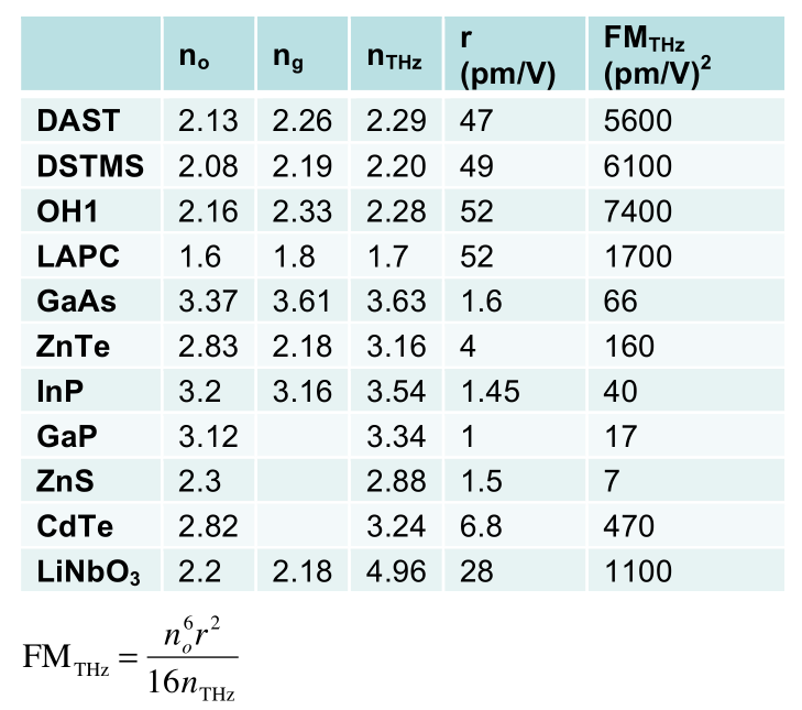 表1:光学-太赫兹频率转换研究的有机和无机非线性光学材料的相关参数。在泵浦光波长处的折射率n0和基团指数ng;折射率nTHz在THz范围内;电光系数r;利用光学整流产生THz的优点FMTHz图。 有机晶体:DAST, DSTMS, OH1 LAPC:主-客体聚合物 无机晶体:GaAs, ZnTe, InP, GaP, ZnS, CdTe, LiNbO3