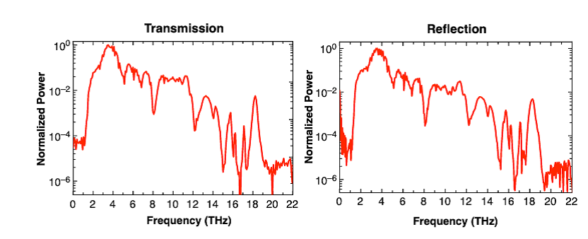 在TeraSys?- ULTRA中使用0.45 mm厚的DSTMS晶体来产生和检测THz,并使用一个脉冲长度为20 fs的泵浦激光器,平均功率为120 mW,能量/脉冲为3.5 nJ。