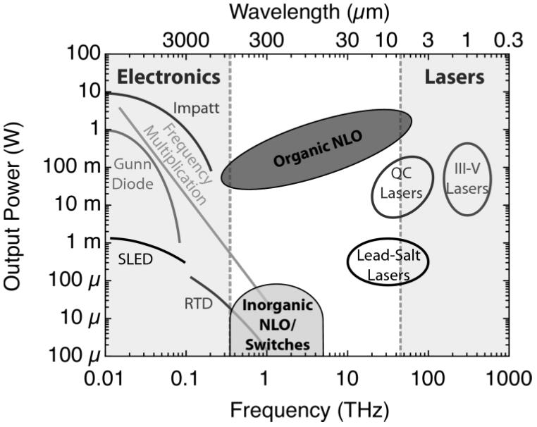 由于有机材料与无机材料相比具有更大的非线性光学灵敏度和速度匹配,因此利用有机材料作为THz发生器可以获得更大的功率级,但受到材料损伤阈值的限制。