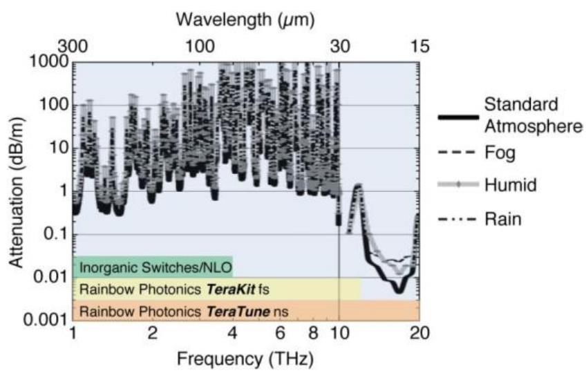 许多材料不仅在高达约3 THz的THz范围内都表现出特定的吸收特性(指纹),因为光电导天线可以达到该范围,但也高于上面的范围,因此进行了广泛的研究,请参见下表。水蒸气的吸收导致在空气中的衰减,这限制了大约10 THz以下的应用可能性范围变得更小(在18 THz时达到四个数量级),这使得高达20 THz扩展THz的范围引起了关注。