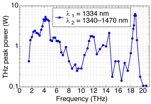 高THz峰值功率超过30 W使用OH1产生晶体可以达到1.25 THz,使用1毫米厚DSTMS晶体的可调谐谱如图所示。