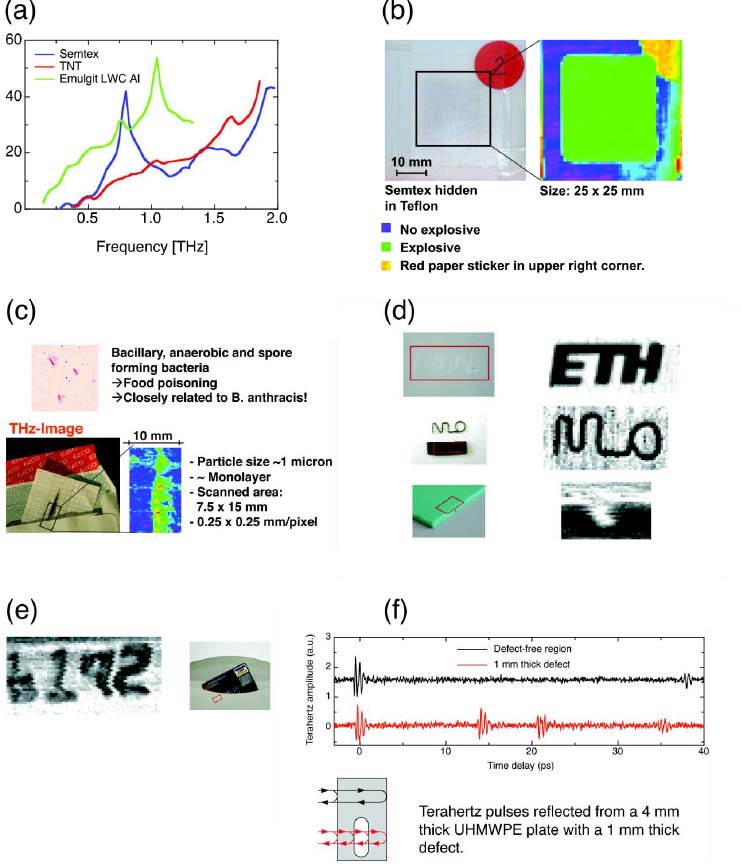(d) 显示了一堆透明胶片的光学和THz图片,其中标签“ ETH”已在其中一张透明胶片中被切掉(可见光看不到),并且由于相位的原因,其THz透射图像给出了完整的对比度图像,切除区域中太赫兹波的偏移(“缺陷”)。 第二张图片显示了如何通过太赫兹波使嵌入塑料中的金属缺陷或夹杂物(带有“ NLO”符号的金属线)可见。最后一幅图显示了一块塑料上的一个空洞,