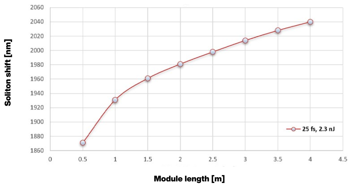 拥有这种SSFS模块后您可能会发现,之前老旧的1um Yb激光器可调谐到1600 nm了,或者1550 nm的掺 Er光纤飞秒激光器也可成为2000 nm光源!SSFS模块可实现完全连续调谐。图2给出了典型的25fs输入脉冲的可调谐曲线,现在只需转动电源旋钮,就可以实现500 nm以上的可调谐性,这一切都要归功于这个比书本更小的完全无源、完全即插即用的SSFS自频移调谐模块。该模块成本仅占一台新飞秒激光系统的小部分。如果用户告诉详细需求,我们还可以为您建议最佳光纤长度模块,以优化性能并进一步降低成本,模块中光纤长度可参考图3。