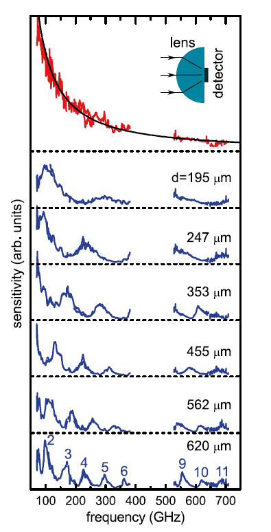 我们的许多客户已经知道,我们的太赫兹传感器阵列/成像摄像机中使用的太赫兹检测器是宽带类型的,这使他们能够在50 GHz至700 GHz整个认证范围内拾取辐射。 但是,我们的探测器的灵敏度(即测得的频率响应)不是单调的,因此不代表连续曲线。 由于检测器的检测器基板(即内部的晶体)内部存在辐射干扰,因此其响应度由多个峰和滴组成。 这是我们的新想法,并始终告诉客户,我们的专家可以在制造阶段调整响应度曲线中最大值的位置,以与客户喜欢的频率相匹配。